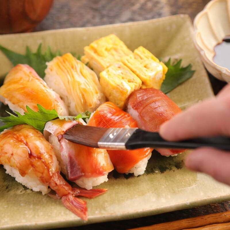 左手の指にネタを置き、右手の人差し指を使ってわさびをネタの中央に塗りつける。