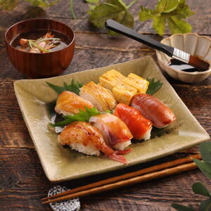 器に寿司を盛り付け、味噌汁を温め直して器に盛り付ける。お好みで、ネタにたまりしょうゆをはけで塗る。