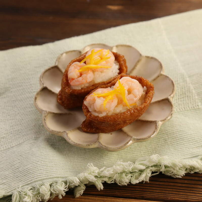 <2>を内側に軽く折り、ごはん1/4量を詰めて形をととのえる。同様に計4個作る。えびをトッピングし、千切りのゆずを乗せる。