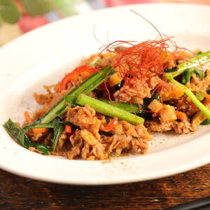 器に<8>を盛りつけ、唐辛子を飾る。お好みで黒七味をかける。