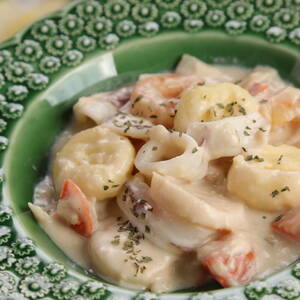 【盛り付け】器にニョッキを盛り付けシチューをかける。お好みでドライパセリを散らす。