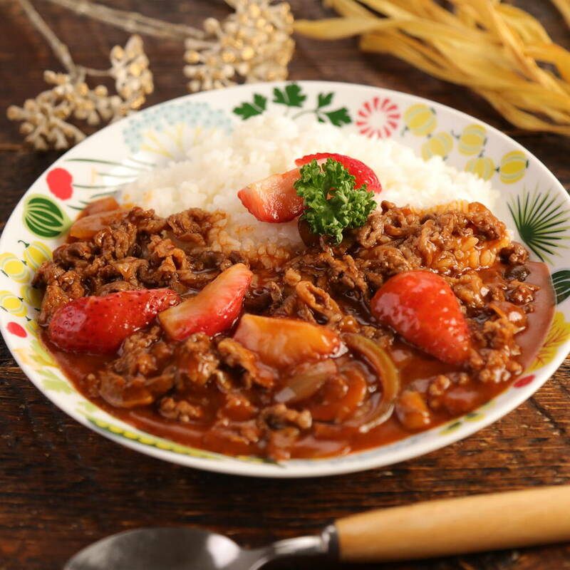 器にご飯と、<6>を盛り付ける。トッピング用のいちごとパセリを飾る。