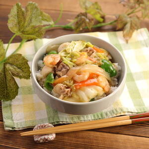 フライパンにサラダ油を熱し、豚肉、むきえびを炒める。