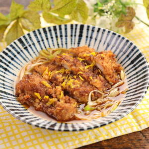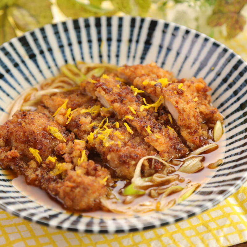 170〜180℃に熱したサラダ油できつね色になるまで5分ほど揚げる。揚げバットに取りだし、油を切る。中まで火が通ったら粗熱を取って食べやすい大きさに切る。
