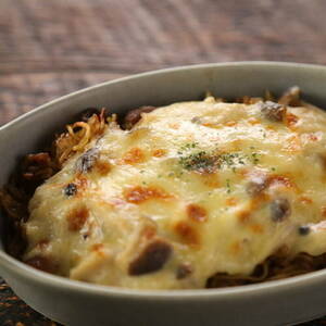 【ホワイトソース】 玉ねぎは薄切りにする。しめじは石づきを取ってほぐす。