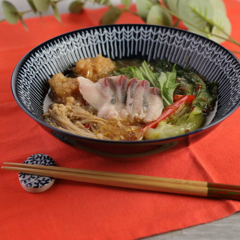 【盛り付け】温めたスープでぶりをくぐらせ、軽く火を通す。 器に春雨と<8>のスープを入れ、具材とぶりを盛り付ける。