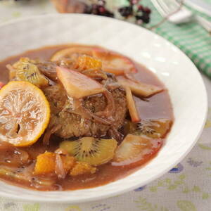 ウスターソースを入れてまぜ、<7>を入れ戻し、<3>を加えて蓋をして弱火で4分煮込む。(途中ソースをかけながら煮込んでください)