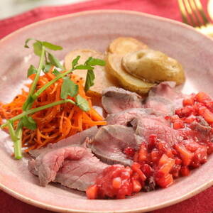 ローストビーフを薄く切って盛り付け、<6>をかける。<8>、<9>、クレソンを添える。