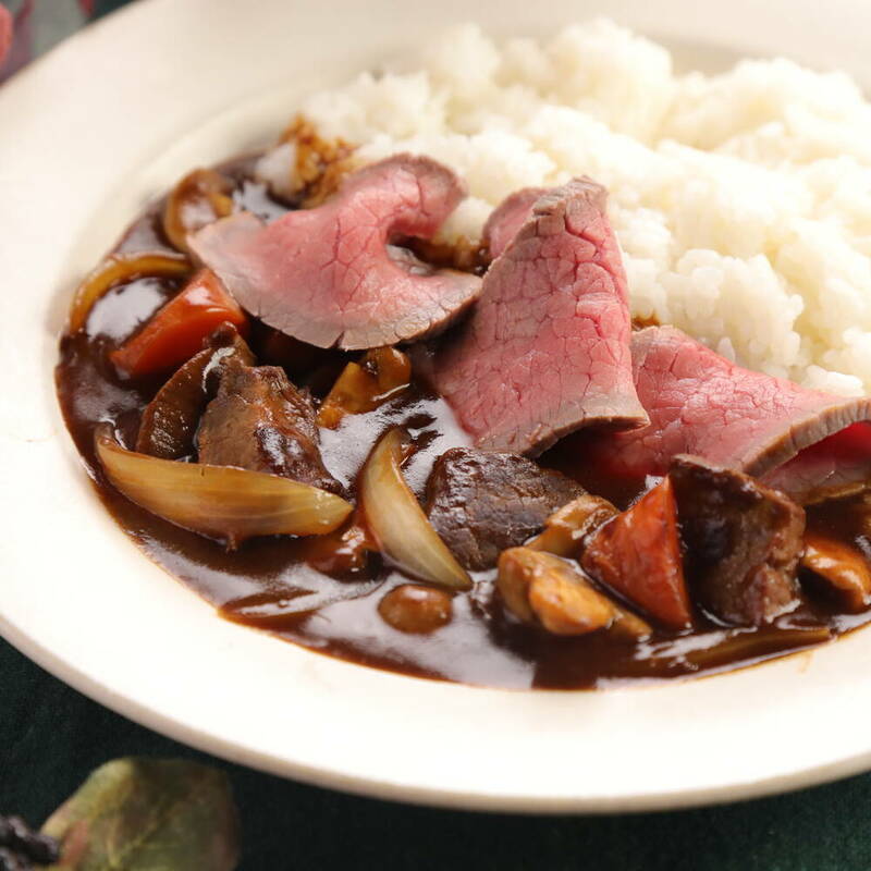 【ビーフシチュー】空いたフライパンをキッチンペーパーで汚れを拭き取りサラダ油をひいて中火で加熱して、角切りの牛肉を焼く。焼き色がついてきたら玉ねぎ、マッシュルームを炒め合わせる。