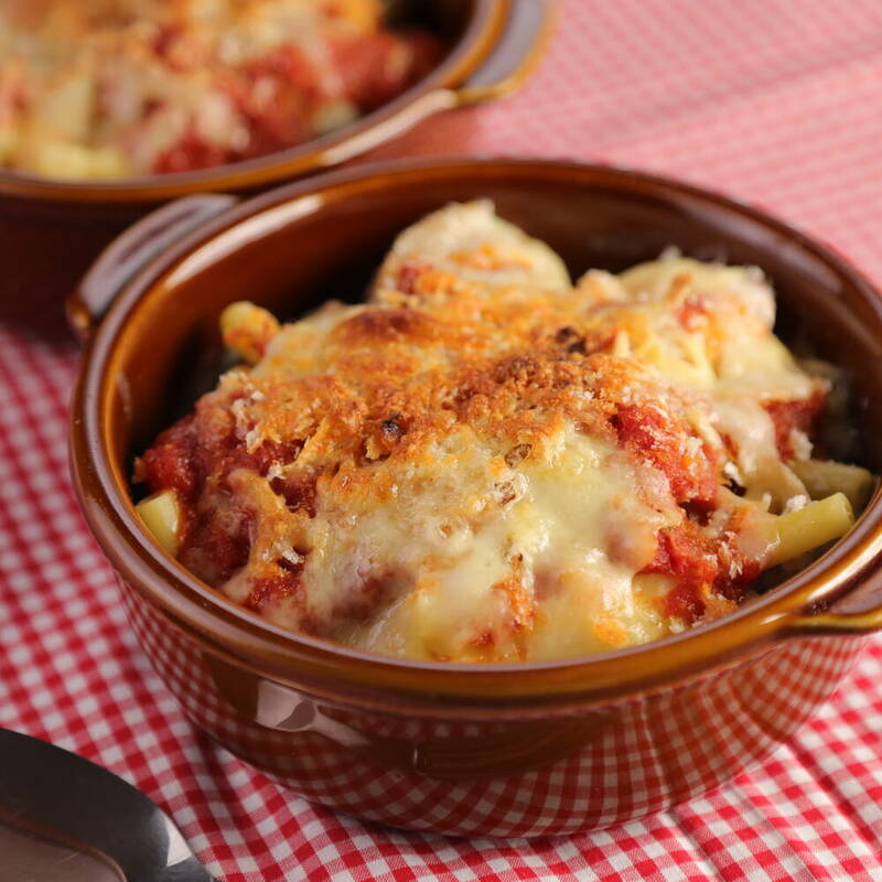 【仕上げ】耐熱皿に<8>を半量ずつ入れ、<10>を半量ずつかける。ミックスチーズ、パン粉を半量ずつのせる。