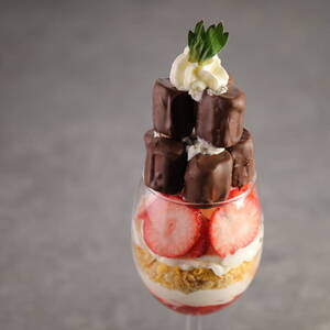 【組み立て】 いちごソースを入れ、生クリームを絞る。<7>を平に敷き詰め、生クリームを絞る。輪切りのいちごをグラスの側面に立てかけ、中心を刻んだいちごで埋める。