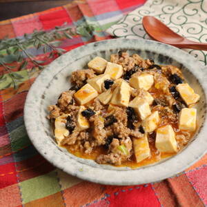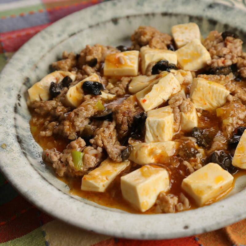 【A】を加えて、とろみが出るまで混ぜながら加熱する。ブラックオリーブ、豆腐を加えてさっと混ぜ合わせ、塩で味を調える。