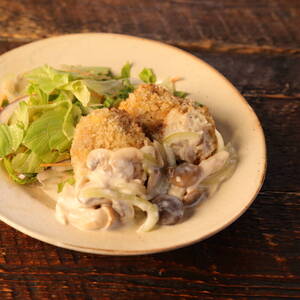 【盛り付け】器に<5>のメンチカツを盛り付け、シャンピニオンソースをかける。お好みで野菜を添える。