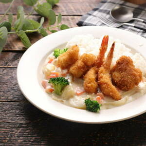器にご飯、シチューを盛り付ける。それぞれのフライを添える。