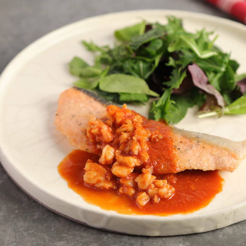 【ムニエル】鮭は両面に塩、粗びき黒こしょうをふる。