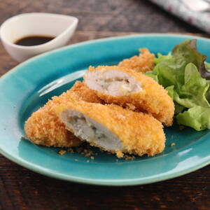 <4>に<3>をくぐらせ、パン粉をしっかりとつける。170〜180℃に熱したサラダ油で揚げる。全体がきつね色になったらバットなどで油を切る。