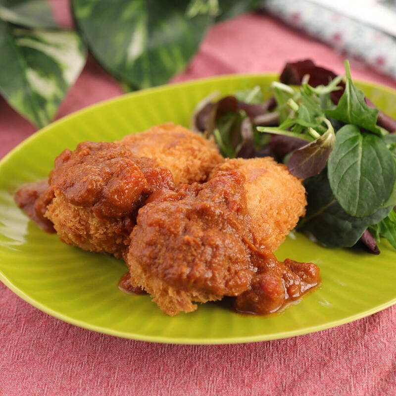 【盛り付け】器にコロッケを盛り付け、マサラソースをかける。お好みで野菜を添える。