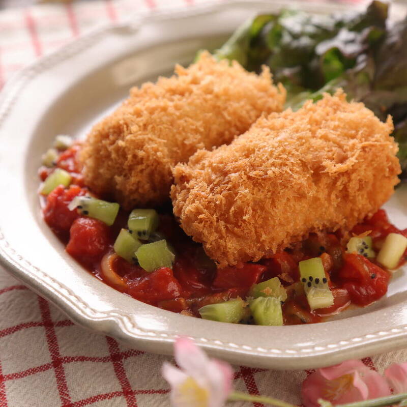 器にソースを敷き、コロッケを盛り付け、残ったキウイを散らす。