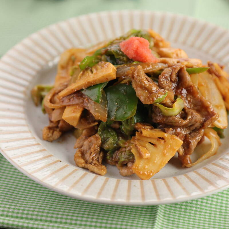 キャベツは芯を除き、大きめのひと口大にちぎる。玉ねぎは1cm幅のくし形に切る。ピーマンは種とわたを除き、乱切りにする。たけのこは3mm幅の薄切りにする。