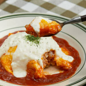 チーズが溶けたら取り出しソースを周りにかける。お好みでパセリ・ブラックペッパーをかける。